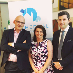 Professor Johnathan Moore (left) with Jill Campbell, Head of Enhanced Optical Services, Specsavers and Ross Campbell, Director of Optometry Advancement, Specsavers, at the first post-op cataract management training session with Cathedral Eye Clinic.